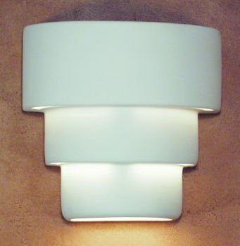 | Shown as UnfinishedOptional finishes available belowBulb not included American-made paintable ceramic wall sconce Other lamping options: Fluorescent: 1-13W CFL Halogen: 1-100W Double Envelope Medium Base Outdoor/WET: 1-100W Tuff Skin A19 Medium Base Standard lamping: 1-100W A19 Medium Base Dark sky Green product Made in USA 9.75 in. L x 5.75 in. W x 9.5 in. H A stunning closed top wall sconce, the San Jose emits down-light from each of its three stepped semi-circular elements. From Art Deco to Southwestern, contemporary to traditional, San Jose can fit a variety of design styles, depending on which finish you choose. ...Read more |